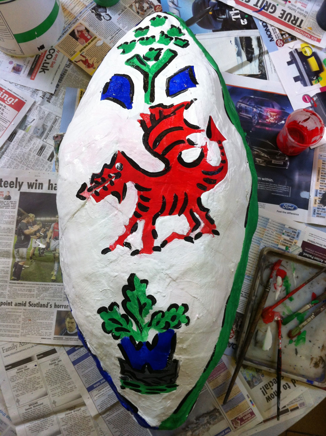 There were some great ideas on arrival at the school and the children were keen to experiment with materials to create these ideas. Influenced by David Blandy’s artwork ‘The Devil and Dylan Thomas’, a group decided to produce masks based on the characters. They made an impression into earth and then poured in plaster to create mask.A second group wanted to create some 3D Iconic models from chicken wire & ‘mod rock’. They created a rugby ball with their school logo, Eco schools & Wales painted on top.