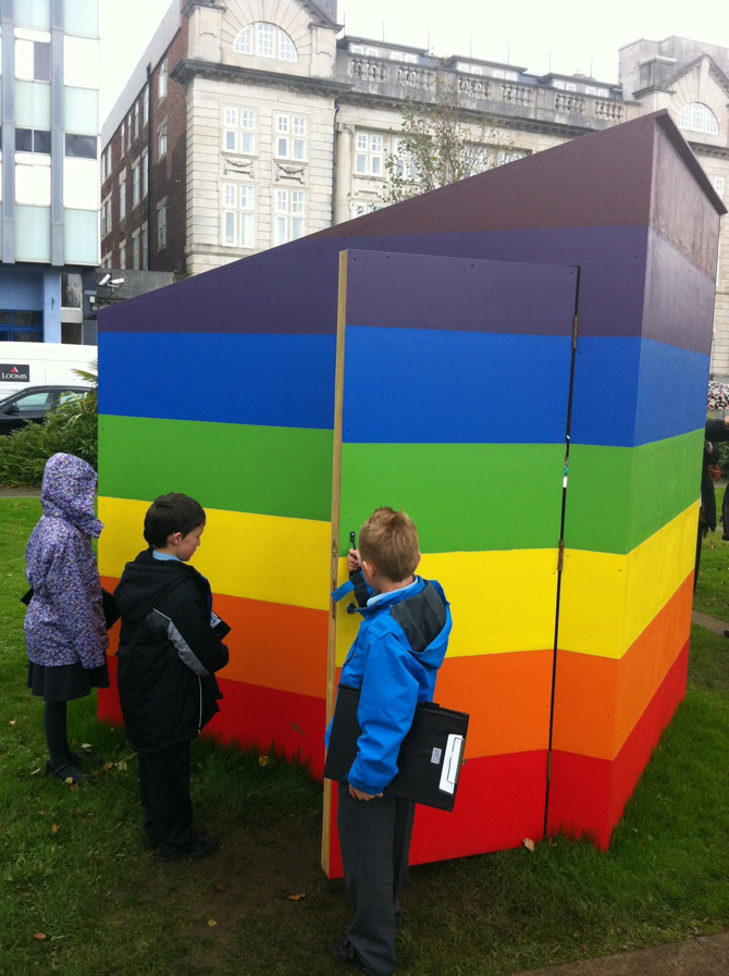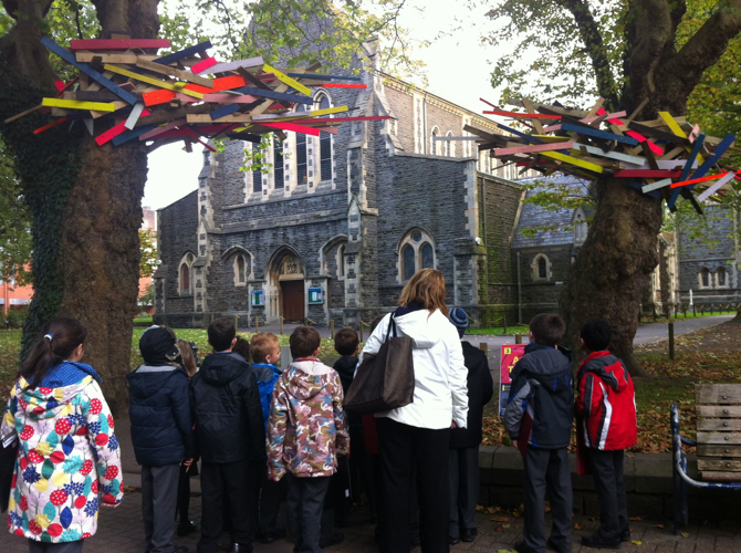 The children from St Josephs were very focused and instantly seem quite perceptive in their comments. ‘Welcome to our shopping centre” said Caitlin referring to Fiona Curren’s work, “It looks like every colour in the world has been turned into wood and put it on a tree”. “It looks like an accident”, says Sam. Alex said is it a jumbled up rainbow with a hole in it. So yet again Fiona Curran’s “Accident looking for somewhere to happen got the mind set of the group to think differently and freely express their views on the Artwork.