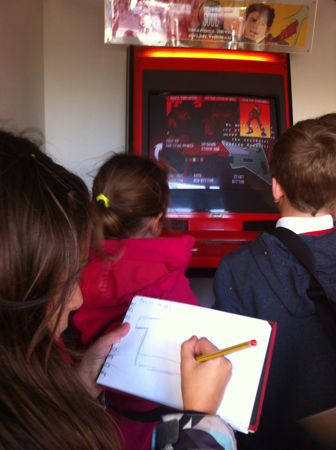 Again Fiona Curran’s work was related to as broken bridge, two boats, or a rainbow. Lavinia questioned what David Blandy’s work had to do with art, as most of the children were only keen on a the game of Guitar Hero which was instantly recognised. I explained the piece and said, “Being a collaborative project, the process will be very relevant for group work in the school”.