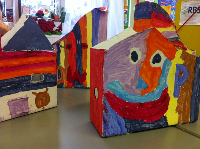 Another group created a very vibrant and exciting art piece using lots of little boxes. This was a response to Tatham and O’Sullivan’s ‘Shelters’, and the children were very fortunate with the resources provided by the caretaker and the class teacher who worked hard sourcing the large logs to put these sculptures upon.