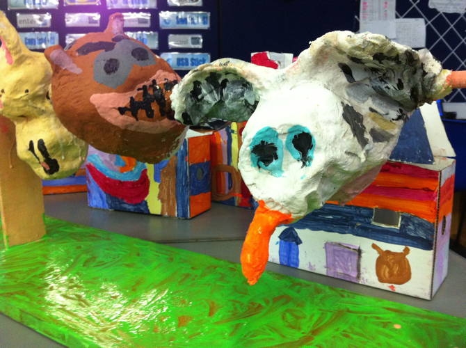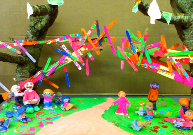 The children were very excited to start their art works. They had already began creating a version of Fiona Curran’s ‘An accident waiting to happen’ or as they called it ‘Broken bridge’. The whole class contributed to the piece and made small clay models of people, which were underneath a broken structure. Each child added a coloured stick to the sculpture.
