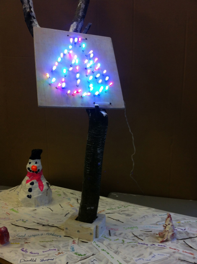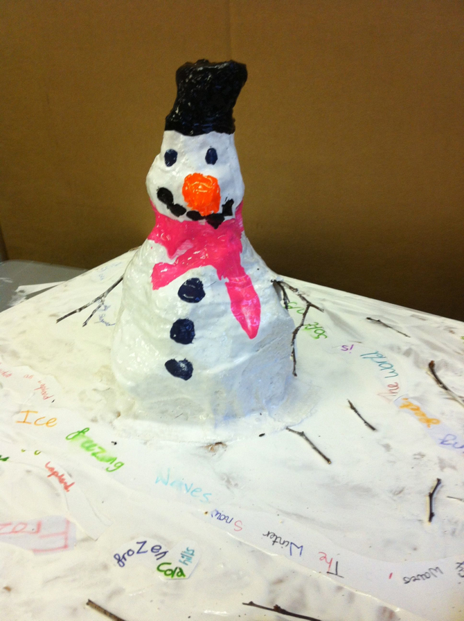 One group had the fantastic idea to make a cockleshell shaped neon using fairy lights. This David Marchant inspired piece also incorporated the work of Dylan Thomas. The children wanted to fit the Dylan Thomas element into their terms work and therefore decided to base the piece upon his story, ‘A child’s Christmas in Wales’. The neon cockleshell stood above a ceramic snowman and a floor covered in strips of paper, each piece containing a quote from the story. It was a beautiful scene.