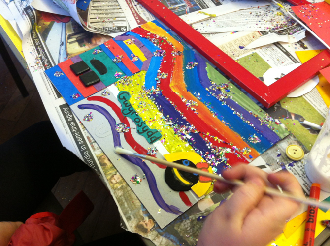 Back at school we decided to make an 8×4 collage of Locws 2012 using lots of materials that the teachers had provided. At the halfway stage of our production Leanne said, ‘Wow that is awesome’. This was a very positive reaction to the work.
